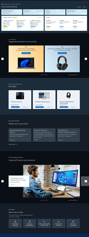 A plataforma Direct Consumer (B2C) da Dell.com impulsiona as vendas online globais de PCs, acessórios e produtos gamer, incluindo a linha Alienware. Como parte da estratégia de longo prazo de comércio digital da Dell, a empresa está conduzindo uma transição para jornadas de compra totalmente self-service até 2030, reduzindo interações de baixa complexidade com times de vendas e permitindo que clientes realizem compras tecnológicas complexas de forma autônoma no ambiente digital.